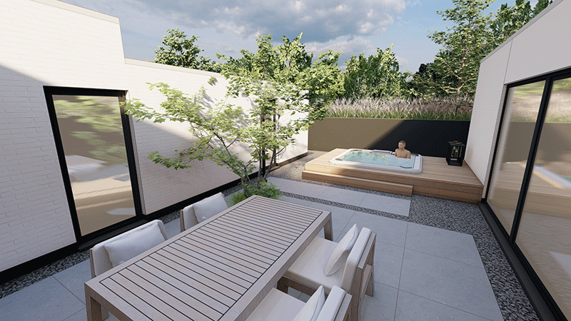 Voor ultiem comfort hebben we in de patio een wellness-ruimte ontworpen. Onze ontwerpers hebben op deze plek onder andere een heerlijk spa-bad bedacht. Deze ligt verzonken in een houten vlonder. Ook staat in deze patio een tuintafel met luxe tuinstoelen, waar men heerlijk kan ontspannen in de beschutting en privacy van de woning.