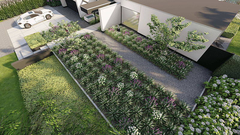 Het nieuwe tuinontwerp is onderdeel van een grootscheepse renovatie van de onlangs aangekochte jaren ‘60-woning. Onze tuinarchitecten ontwierpen een volledig nieuwe voor- en achtertuin en zette de schetsen om in realistische 3D-impressies. Zo weten onze klanten precies hoe hun toekomstige tuin eruit komt te zien.