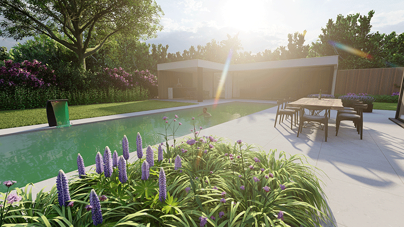 Naast het zwembad hebben onze architecten een prachtig modern poolhouse ingetekend in het ontwerp. Met grote ramen, een bar en loungemeubilair is dit poolhouse de ideale plek om na het zwemmen te genieten van een verfrissend drankje. Doordat het poolhouse volledig afgesloten kan worden, is het ook een ideale plek om ‘s winters van de tuin te genieten. Het uiterlijk van het poolhouse sluit perfect aan op het ontwerp van de woning. Onder de overkapping hebben we een prachtige buitenkeuken gepland, waar de eigenaars op zomerse avonden heerlijke diners kunnen bereiden.