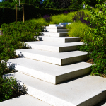 Deze robuuste megategels hebben we in ongelijke treden al kronkelend naar beneden gelegd, waardoor als het ware het effect ontstaat van een rotachtige berghelling. Aan beide kanten is de trap omgeven door weelderige siergrassen. Hierdoor heeft het hoogteverschil een visueel toegevoegde waarde. De natuurlijke grijstinten combineren op fraaie wijze met het groen in de rest van de tuin.