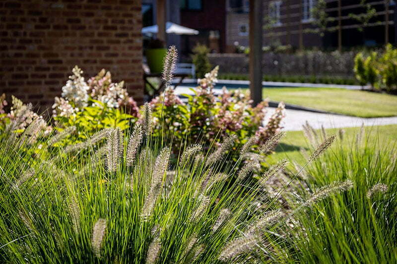 De wens van deze klanten was een tuin die meegroeit met de kinderen. Met een slim ontwerp zorgden onze tuinarchitecten ervoor dat deze tuin even stijlvol als kindvriendelijk is. De jonge kinderen kunnen zich helemaal uitleven in het zwembad of genieten van de speelhoek met het klimtoestel achter in de tuin. Naarmate de jaren verstrijken kan de tuin aangepast worden aan de leeftijd van de kinderen. Wanneer zij ouder worden, kunnen de eigenaars het speeltoestel weghalen, waardoor er een fraai gazon ontstaat. Hier kunnen de kinderen bijvoorbeeld een balletje trappen.
