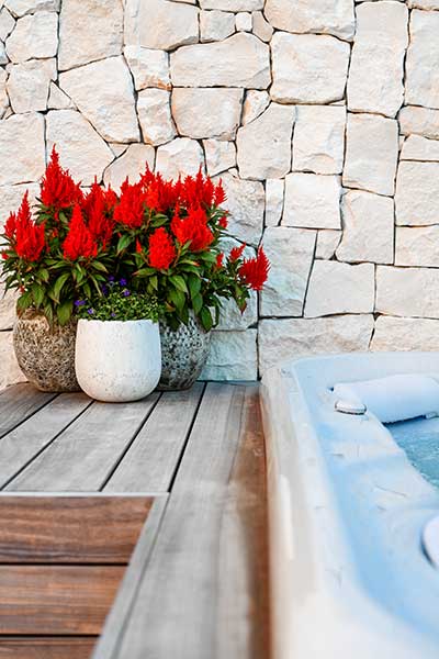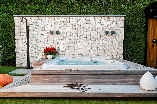 In deze tuin hebben we ervoor gekozen de jacuzzi gedeeltelijk in te graven. Dat betekent dat een deel van het bad boven de grond en een deel van het bad zich onder de grond bevindt. Om de jacuzzi hebben we een gelaagd houten plateau gebouwd. Hierdoor kan de klant makkelijk het water in- en uitstappen. Het hout geeft de tuin bovendien een rustgevende, natuurlijke uitstraling.