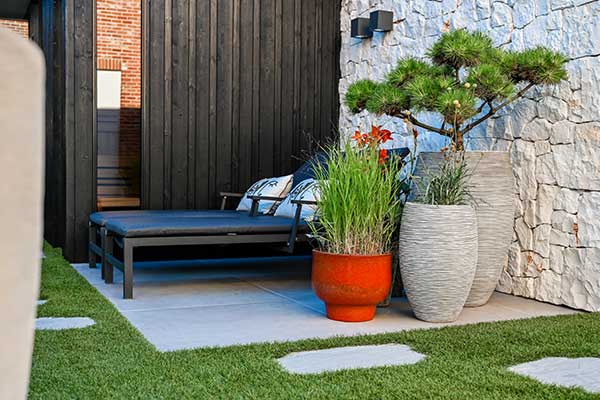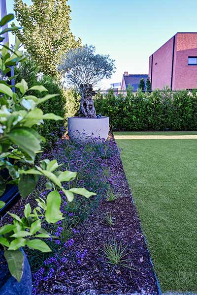 Een belangrijke wens van deze klant was om de tuin zo onderhoudsvriendelijk mogelijk te houden. Daarom hebben we voor het gazon in deze tuin gekozen voor kunstgras (Royal Grass Bliss). Dit type kunstgras oogt zeer natuurgetrouw, ziet er het hele jaar door, onder alle weersomstandigheden, prachtig uit en vergt vrijwel geen onderhoud. De klant hoeft bijvoorbeeld geen gras te maaien of het gazon te bemesten, maar geniet nog steeds van een heerlijk groene tuin.